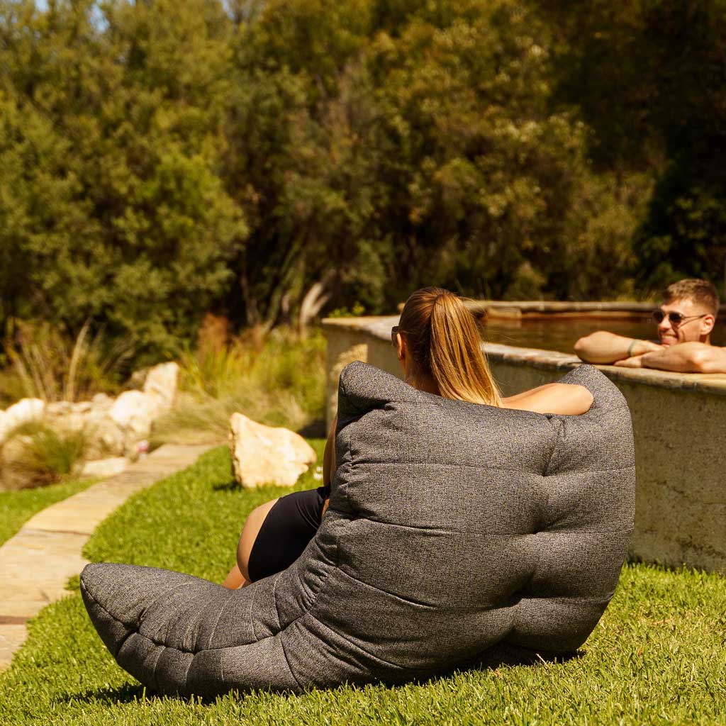 En vacker designad utomhus sittsäck med struktur, quiltning och resort-kvalitetsstil.