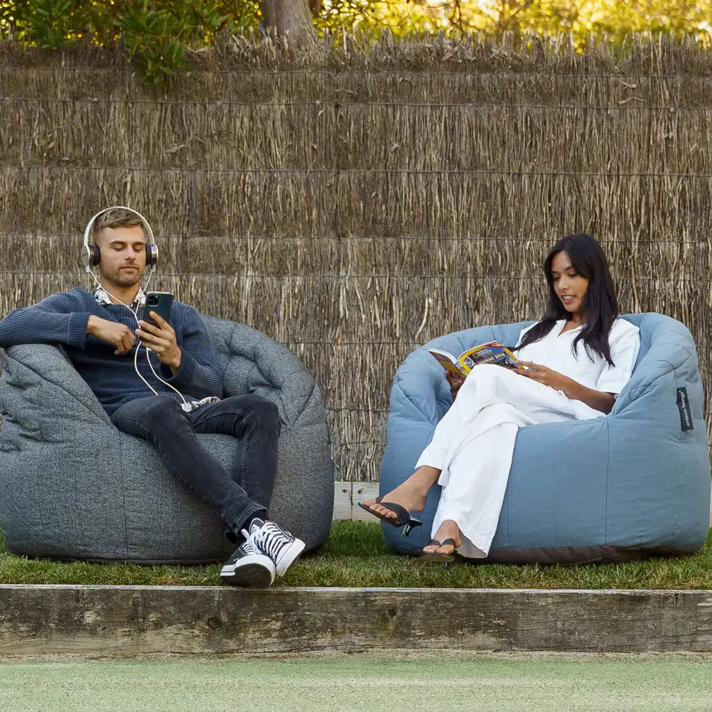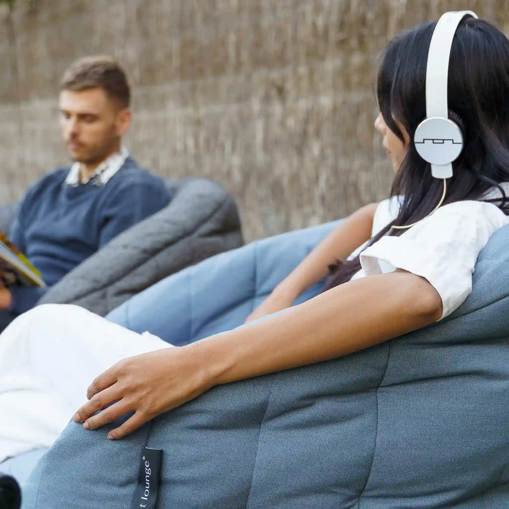 En vacker designad utomhus bean bag-stol från Ambient Lounge® - skapad med kärlek med en drömlik sval-blå ton, elastisk struktur, taktil kviltning och resort-kvalitet stil.