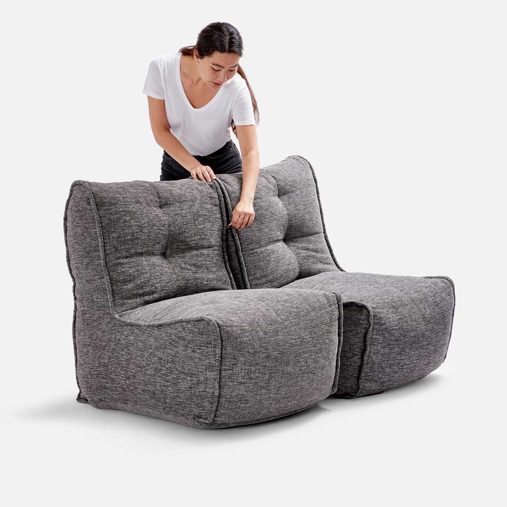 Som du kommer att se är Twin Couch faktiskt två individuella sittplatser som är fästa tillsammans, vilket gör möbeln användbar i den mån att du enkelt kan separera och flytta på den. Varje av de två individuella sittplatserna har två fack som gör att fyllningen inte pressas direkt mot botten som det ofta gör i andra produkter. På insidan sträcker ett speciellt elastiskt band över tyget på ett sätt som ger möbeln det fina utseendet som är så eftertraktat. Det är viktigt att fylla bakdelen nästan till kanten för bra stöd och utseende, medan det för framsidan handlar om din komfortnivå, där de flesta föredrar att låta sittområdet vara något löst, eftersom sätet på detta sätt anpassar sig efter dig.